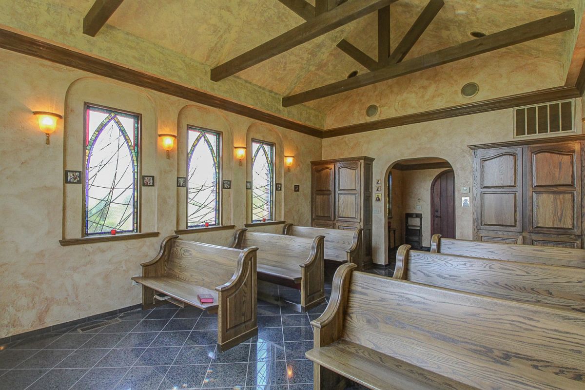 The gold paint on the ceiling shimmers at night when candles and lights are lit.