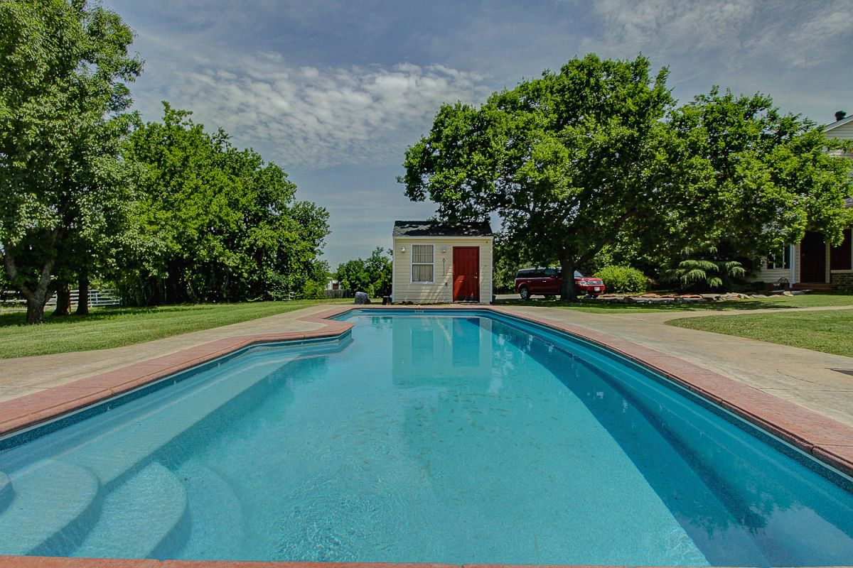 This is the pool with the pool house in the background. The pool house shelters the pump, chemicals and various tools. There is also a chest type freezer here.
