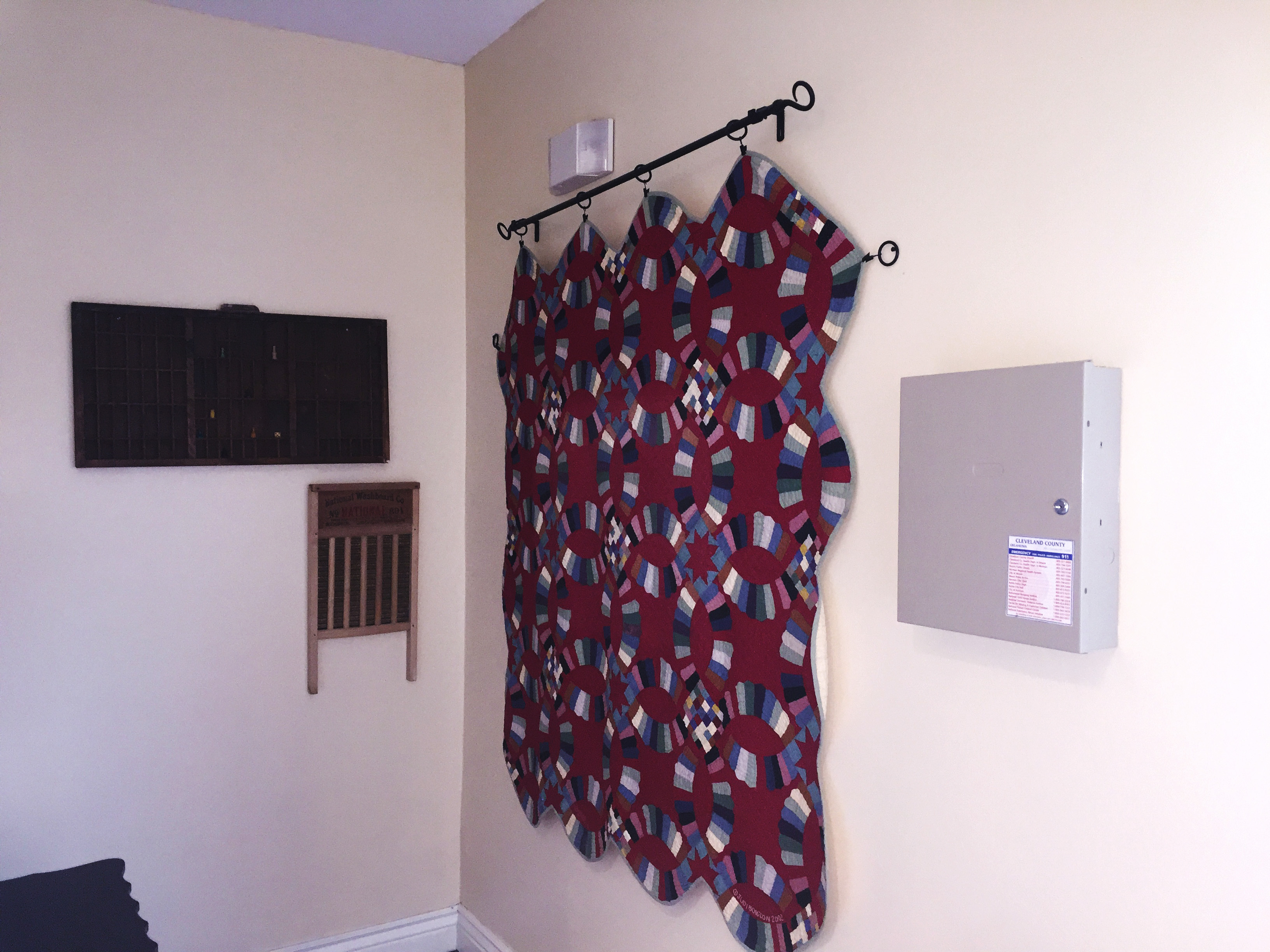 We designed key areas of the farmhouse to run on the alternate power of a generator. Rather than using only two electrical panels for the upstairs and downstairs, we added a third to power the heart of the home, the essentials. The panels are located behind this hanging quilt.