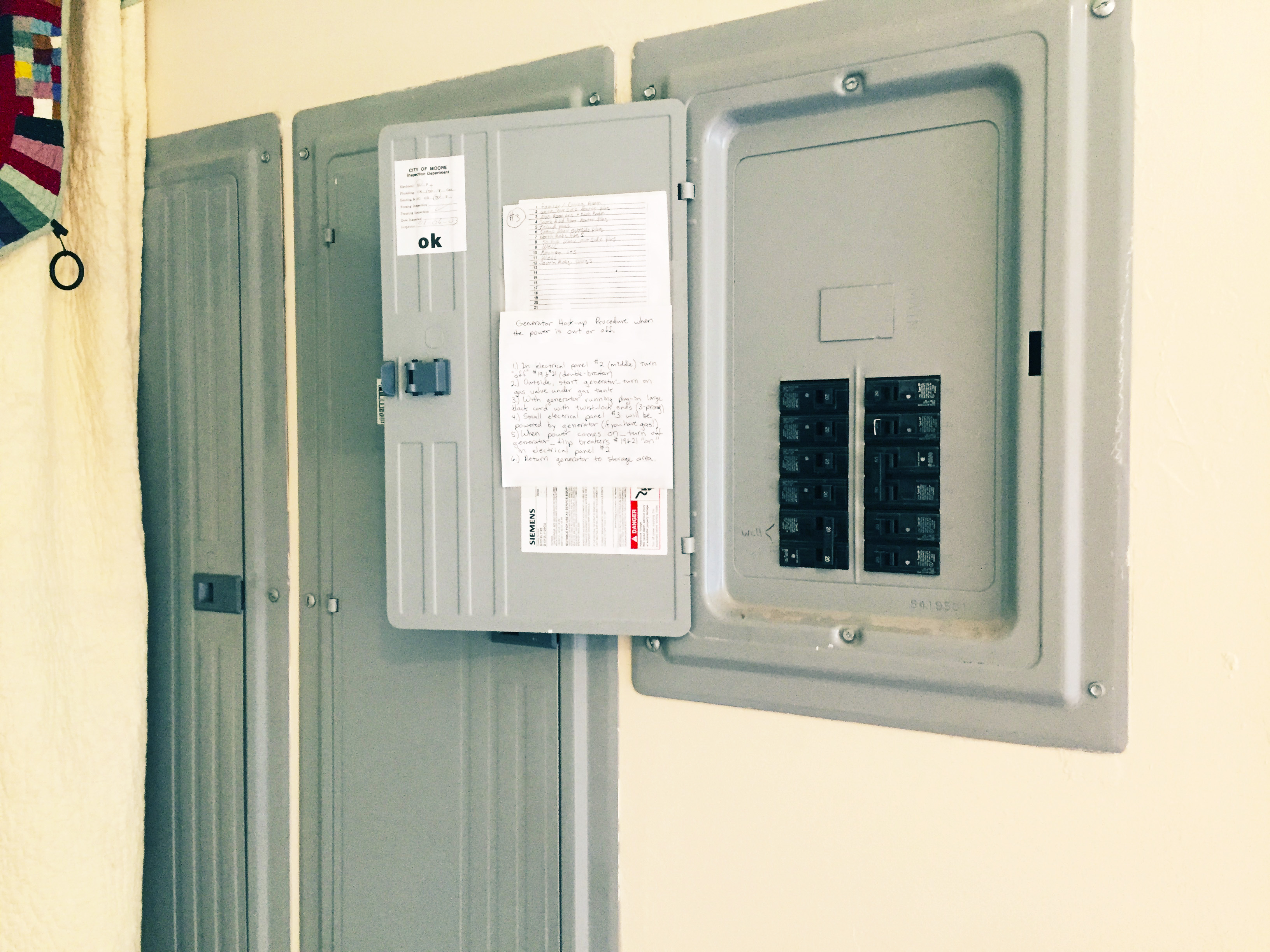 The generator is placed outside the mudroom window on the north side of the house, plugged into the 50 amp, 220 volt outside plug installed for this purpose, and powered on after turning off double breakers 19 and 21 in Panel 2.