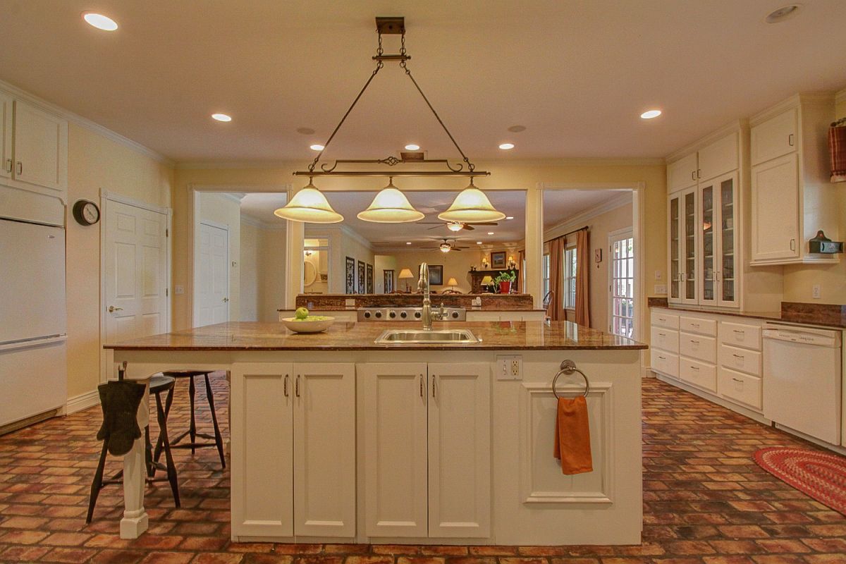 The north side of the kitchen island houses a prep sink and ample storage for appliances, cooking implements, cookbooks, and a large trashcan hidden in a tall cabinet on the right (west) side of the island.