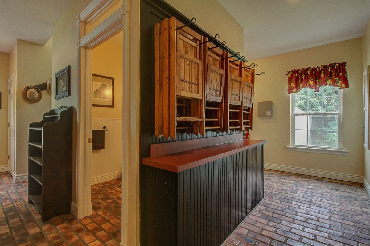 View of Mudroom from north kitchen door. To the left are a powder room, the back stairs, and a back door. To the right are the folding chairs (table cubby underneath), and around the corner, the downstairs laundry room.